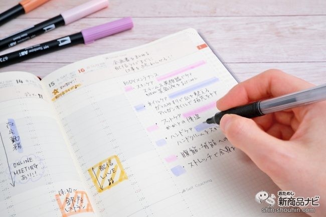 手帳の紙質も大事。淡いクリーム色の用紙は、光を吸収するので目に優しく文字が見やすい。カラーペンなどを使ってもインクが裏抜けしにくく、インクの速乾性も高いので書き心地の良さも抜群。