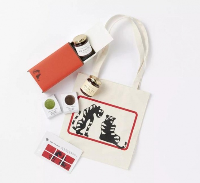 トートは普段使いにもよさそうな大きさ福袋は、トラヤあんスタンドの手提げ袋をモチーフにした帆布生地の「オリジナルトートバッグ」、「あんペースト」、「あんケーキ」、「ヨウカンアラカルト」がセットになっています。価格は5400円です。