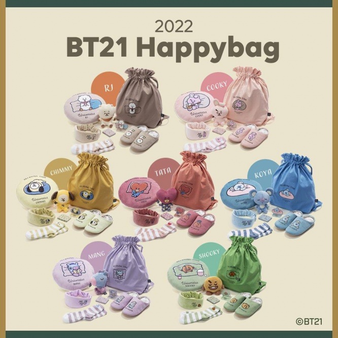 即売り切れの予感「BT21 2022ハッピーバッグ」は、RJ、COOKY、CHIMMY、TATA、KOYA、MANG、 SHOOKYと、それぞれのキャラクターに沿った全7種。いずれも「Relaxing time」をテーマに、日常でも使えるグッズをはじめ、寒い季節にぴったりのおうちアイテムが入っています。