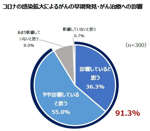 その調査では、「コロナ感染拡大が、がんの早期発見・がん治療へ影響しているか」という質問に対し、9割以上(91.3%)の医師が「影響していると思う」「やや影響していると思う」と回答しているのです。