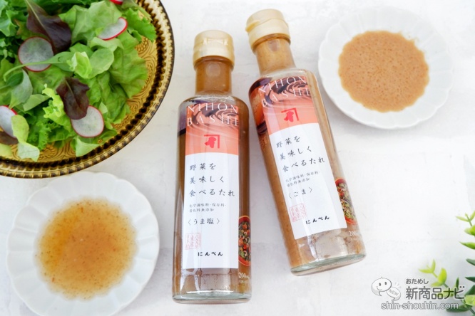 『野菜を美味しく食べるたれ(うま塩)』(200ml・希望小売価格 税込540円・2021年10月12日発売)は、本枯鰹節とレモン果汁、にんにくが織りなす旨みが味わえる。