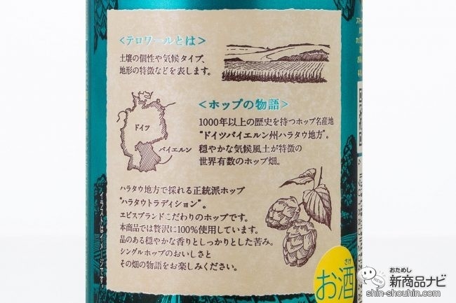 1本あたりのエネルギーは150kcal、糖質は約10.85gちなみに、『ヱビス ホップテロワール』の“テロワール”とは土地を意味するフランス語のこと。特にワインやコーヒーなどの土地特有の個性を表す言葉だ。今回は、ドイツ・バイエルン産のハラタウトラディションを100%使用(シングルホップ)しており、その個性を余すことなく堪能できる。