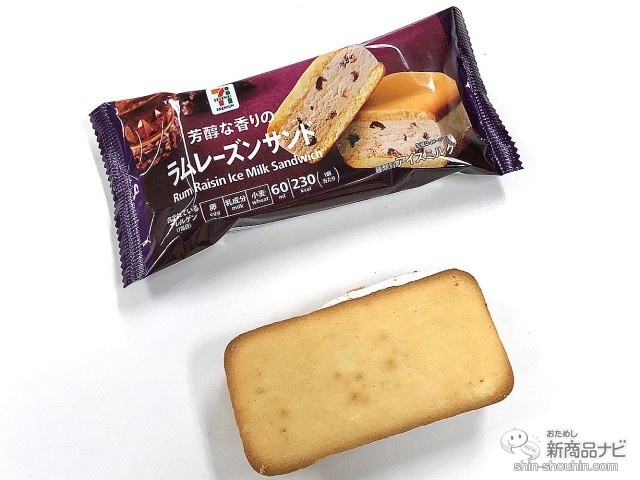 ラムレーズン入りのクリームを、しっとりとしたビスケット生地でサンドしたアイス。