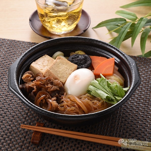 レンジで気軽に食べられる甘辛いすき焼き風の鍋。うどん入りでボリュームたっぷり。