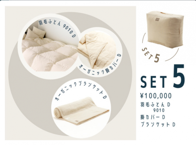 羽毛ふとん(ダブル)セット(100000円)はオーガニック羽毛ふとん(D)とオーガニック掛カバー(D)にオーガニックブランケット(D)を1枚ずつ詰め合わせました。※価格は税込み。
