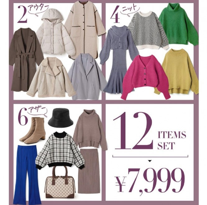 送料無料12点入りで、7999円(送料無料)。そのうち、アウター2点、ニット4点が必ず含まれます。