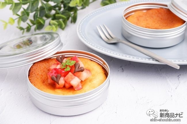 蓋を開けたら、そのまま召し上がれ!手のひらサイズの缶入りで、コロンとしたフォルムが可愛らしい。描かれているのはお店のロゴ。