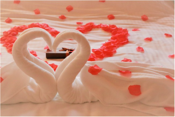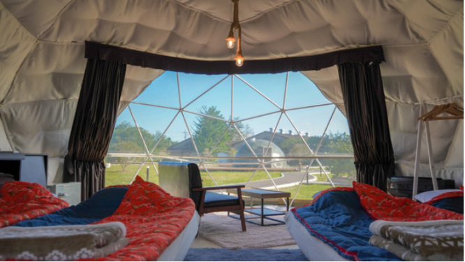 宿泊はドームテントかコテージから選択可能。ベッドの上に花びらを散りばめたロマンチックな空間ですてきな写真撮影ができます。また「BUB RESORT Chosei Village」からチョコレートのプレゼントも用意されています。(画像はプレスリリースより)