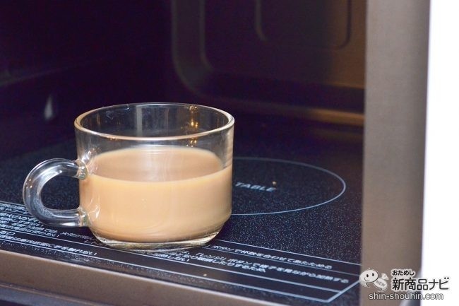 まずは、『カフェベース カフェモカ』をグラスに注ぎ、レンジで温めてホットにしていこう。