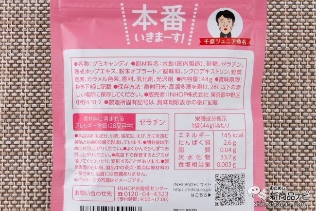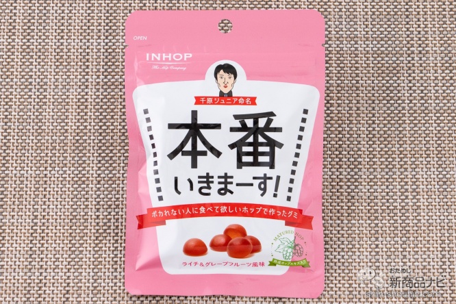 キリンホールディングスが10年以上かけて開発された健康素材「熟成ホップエキス」の魅力をアピールするべく、千原ジュニア氏がネーミングを熟考したグミ菓子。それが『本番いきまーす!』。お笑いライブやTV番組収録など、大事な場面でポカれない芸人ならではの着眼点だ。味の想像もつかないから逆に気になってくる。さっそく確かめてみよう!