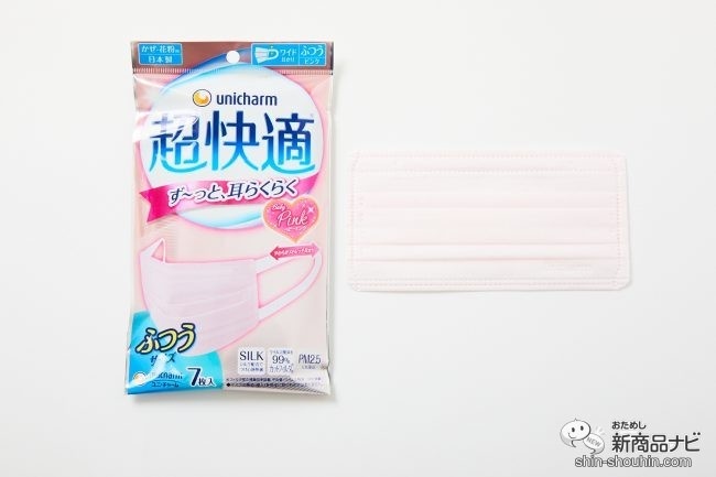 ユニ・チャーム(本社:東京都)の 『超快適マスク ピンク』(7枚入り・参考価格 税込518円・発売中)は、プリーツタイプだが立体マスクのようなフィット感があり、それでいて、口を大きく開けてもずれにくい印象。フィット感が良いマスクは、沢山話すとずれるのが気になるが、こちらは大丈夫そう。もう一つの大きな特徴は、付け心地が良く肌あたりがかなり気持ち良いこと。なんと紐部分の肌あたりも気持ち良く、一度触れるとずっと触っていたくなる(笑)。紐部分は他の商品と比較すると、太くてふんわりしている。