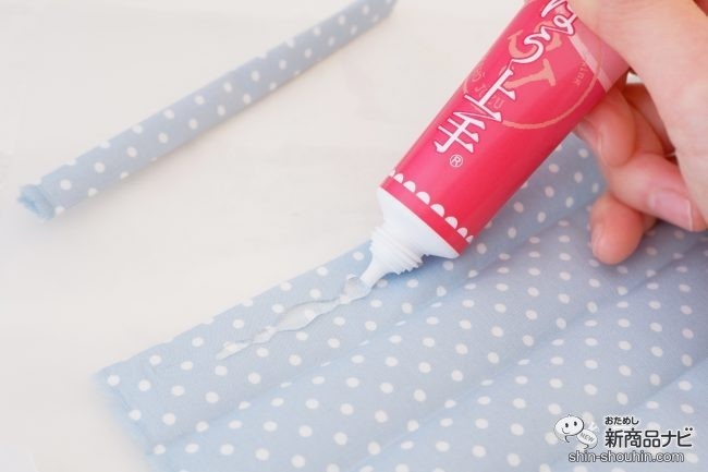 まずは持ち手とループを作るため、アイロンで折り目をつけて接着をしていく。細口ノズルだから適量を取り出しやすく、布に直接塗っていける。
