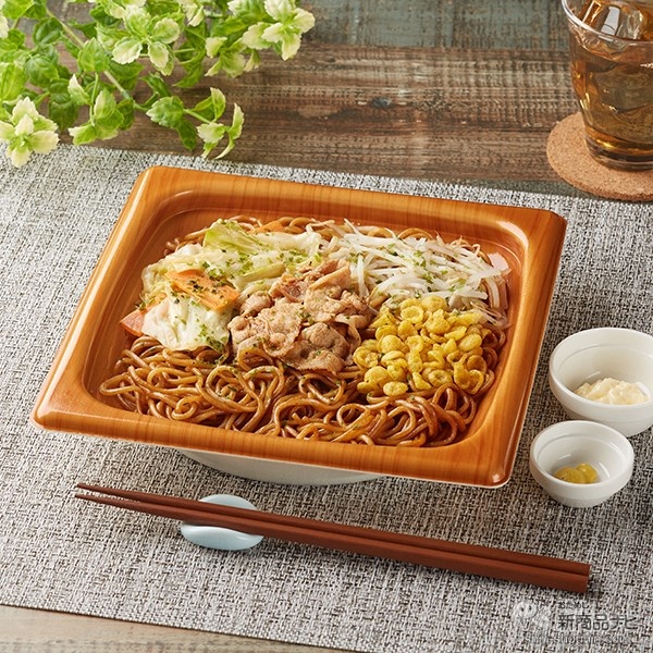 ウマ娘プリティダービーコラボ商品。野菜炒め、揚げ玉などをトッピングした、大盛ソース焼そば。別添で「マヨネーズ」「からし」付き。