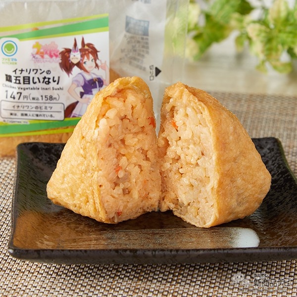 ウマ娘プリティダービーコラボ商品。「イナリワン」のキャラクターにちなみ、鹿毛に近い色あいの鶏五目飯をいなり皮で包みんだ一品。