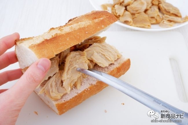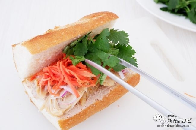 「LIKE CHICKEN!?」を使って、バインミーを作っていこう。バインミーはベトナムのサンドイッチ。レバーペーストやパクチーをはさんで作っていく。