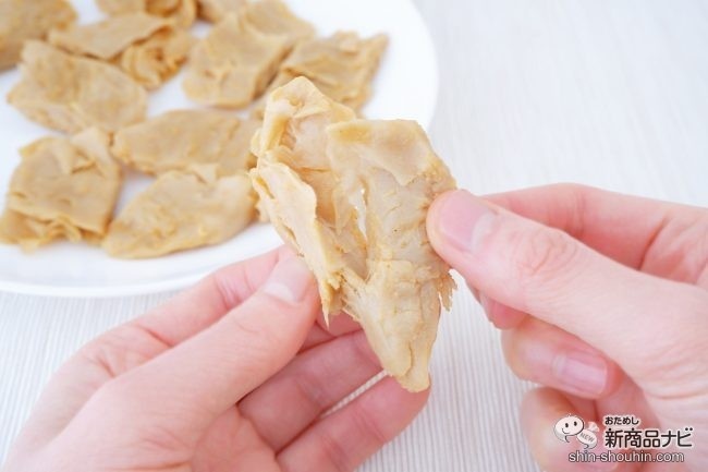 サッと茹で、水気をしっかり拭き取っておく。本当に鶏肉のような繊維感。ふっくらジューシーで、大豆ミート特有の大豆臭さがあまり感じられないから食べやすい。7種類のスパイス(パプリカパウダー、ホワイトペッパー、ショウガ、ナツメグ、メース、カルダモン)で味付けしてあるので、程良くスパイシーさがあり、それらが大豆の臭みを抑えてくれているようだ。