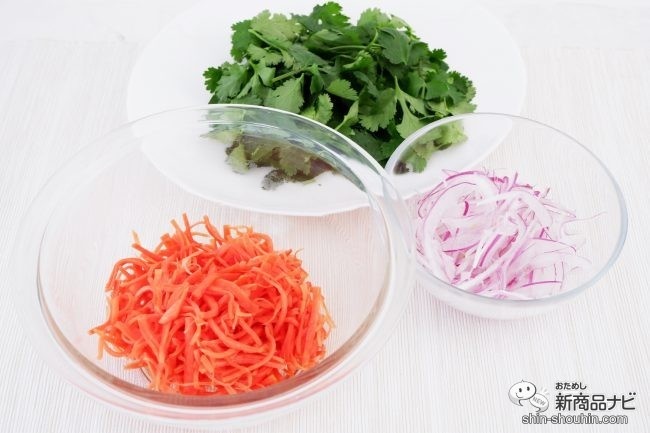 中にいれる野菜やハーブに、にんじんのなます、紫玉ねぎのスライス、パクチーを用意した。