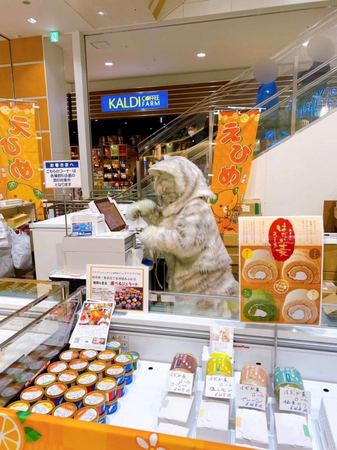 こちらはツイッターユーザーのすいか (@suikasu123)さんが、2022年2月19日に投稿したもの。新潟県内のイオンで撮影されたという写真にはグレーの毛並みの猫が接客している姿が捉えられている。