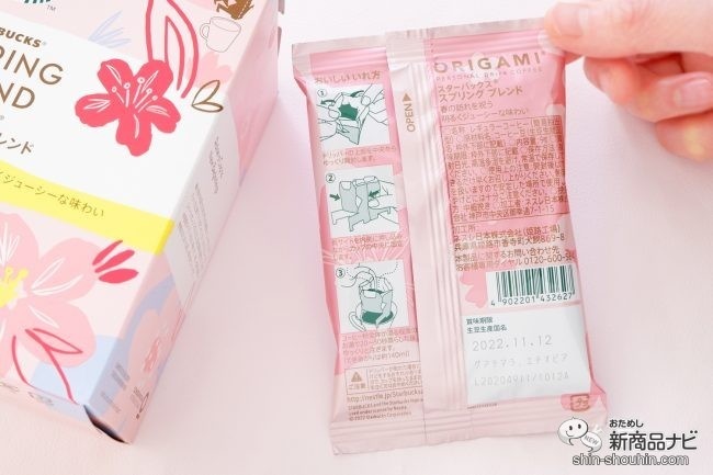 ネスレ日本(兵庫県)『スターバックス オリガミ パーソナルドリップ コーヒー スターバックス スプリング ブレンド』(4袋入・希望小売価格 税込602円・2022年2月14日発売)は、自宅やオフィスで手軽に楽しめる家庭用製品。ちなみにサクラ風味というわけではなく、通常のコーヒー味となる。