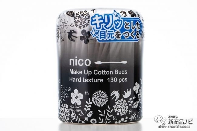 続いて『nico hard メイク用綿棒(ハード)』をおためし! こちらは黒地に白で草花や鳥のイラストが描かれており、ソフトと同様モノトーンのデザインがおしゃれ。