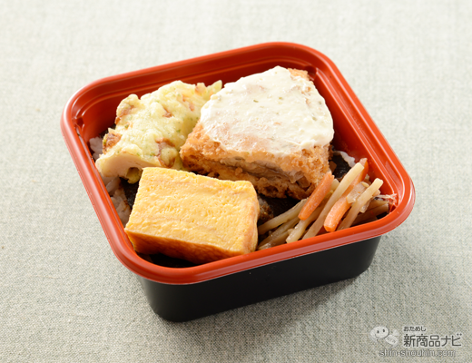 ご飯の量が、おにぎり約1.5個分のお手軽サイズ。白身フライやちくわ天、玉子焼にきんぴらを盛り付け。