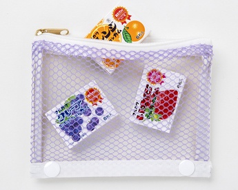 マーブルガムのグレープの柄がプリントされた、取り外し可能なミニポーチも付属されていて、中身が見えるメッシュ素材。ファスナートップは馴染みのある丸いガムにそっくりのかわいいチャームです。