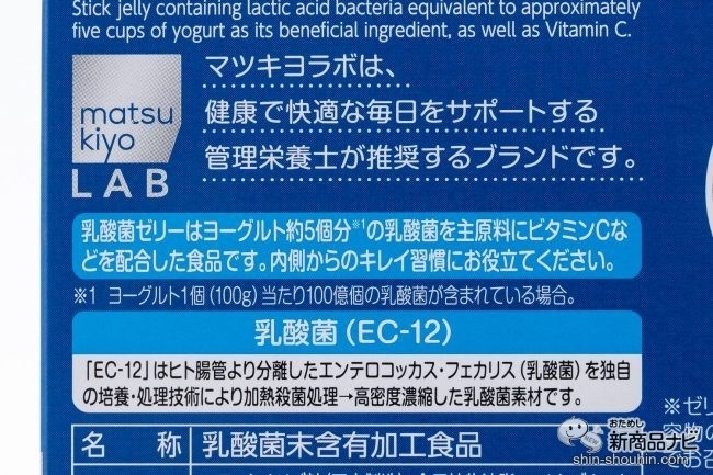乳酸菌EC-12を含有このたび発売されたのは、『matsukiyo LAB 乳酸菌ゼリー』(10g×22包・希望小売価格 税込972円・2022年3月より順次発売)。1包でヨーグルト約5個分の乳酸菌(約500億個)やビタミンCなどが摂取できるヨーグルト味のゼリーだ。