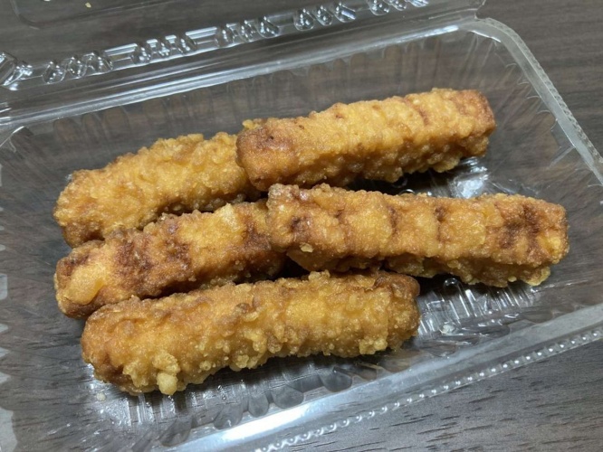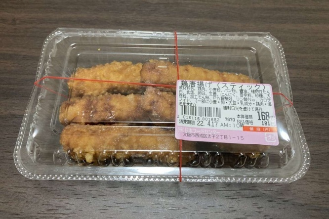 まずは「鶏唐揚げ(スティック)」(税込181円)から見ていきましょう。よくあるお惣菜の唐揚げらしく、茶色がぎっしりと詰まっています。