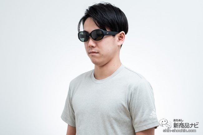 かけ心地は非常に快適。軽量で柔軟性のある素材でフィット感もよく、フレームのシャープ感とツヤが上品。レンズの透明度が高く、視界はうっすらとグレーがかる程度。そのため暗くなりすぎず、外からも目元が見えるので、表情も伝わりやすい。