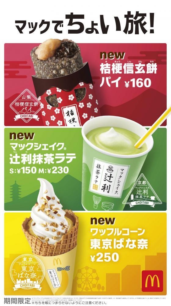 商品は、「マックシェイク 辻利抹茶ラテ」、「桔梗信玄餅パイ」、「ワッフルコーン 東京ばな奈」の3種類です。
