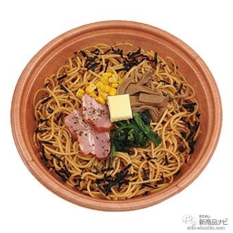 ニンニクと焦がし醤油の和風パスタ。濃厚醤油ベースにバター、3種のきのこ、燻しベーコン、コーンなどの具材に、刻みのりを散らしている。