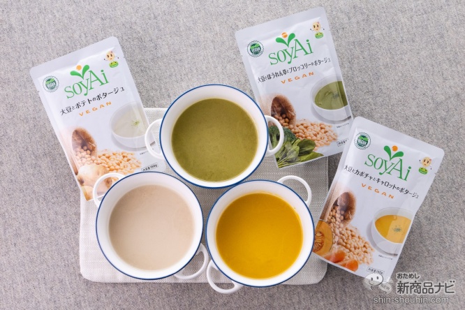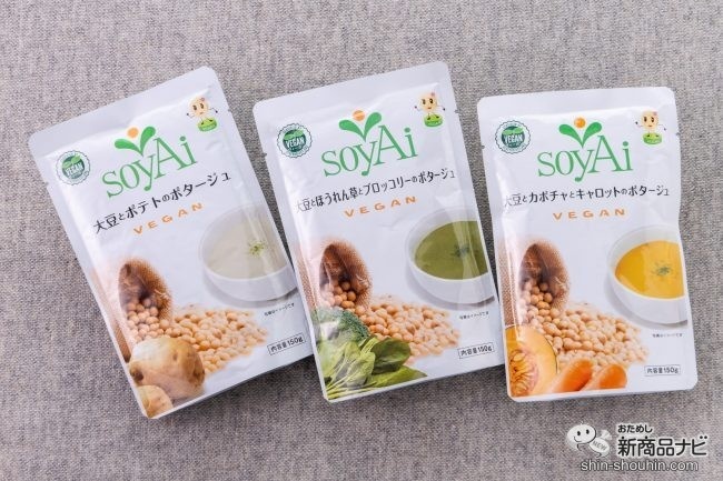 今回記者がためすのは、3種類の『soyAiポタージュ』シリーズ(各150g・価格 税込400円・発売中)。同じくヴィーガン認証を取得している「soyAi大豆ペースト」にさまざまな野菜をミックスした、ヘルシーで健康的なポタージュスープだ。