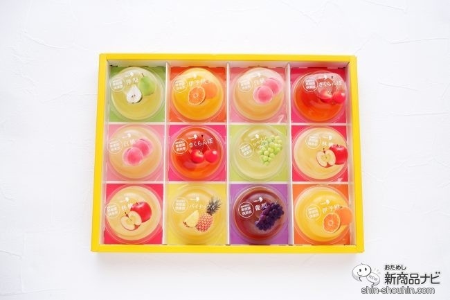 『国産果実の果樹園倶楽部』のゼリーに使われているフルーツは全部で8種類。12個入りには、さくらんぼ、白桃、伊予柑、林檎が各2個入っている。