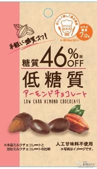 『低糖質アーモンドチョコレート』も同時発売リニューアルされた新包材は、従来のフィルムから紙包材へ変更され、プラごみ削減に貢献している。また、パッケージの印刷にはバイオマスインキを採用。さらに地球環境へ配慮している。なお、バイオマスインキとは樹木や種子、米ぬかなどの植物由来成分や生物由来成分などの再生可能な有機性資源を一部使用して作られたインクとなっている。