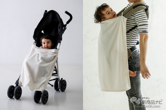 タオル地とリバーシブルになっており、表面が凸凹したワッフル生地なので、肌にあたる面積が少なく暑い日でもさらっと快適。ベビーカーと抱っこ紐どちらでも使用可能で、用途に合わせて紐の長さを調整できるのも◎