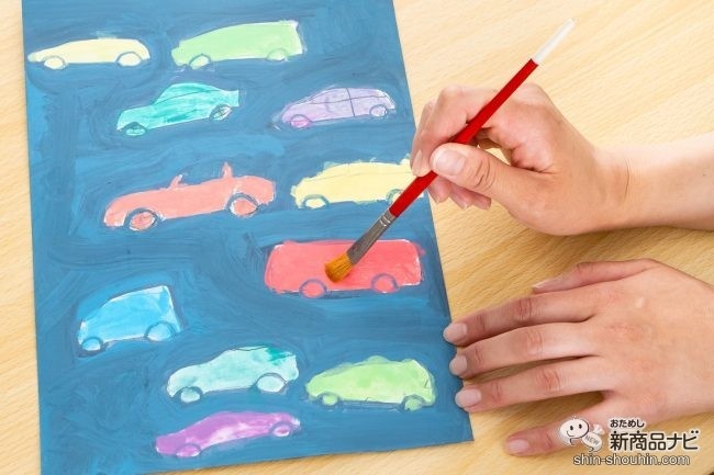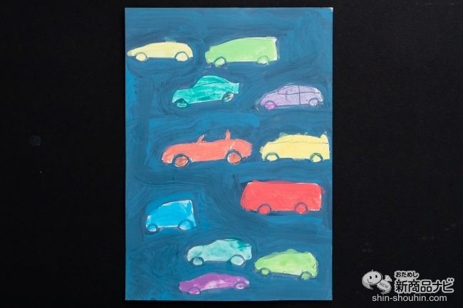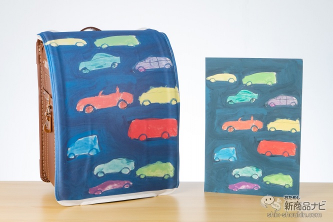大好きな車をモチーフに、高学年になっても飽きずに使えそうなデザインを意識した。その中から息子が選んだのは、車を散りばめたこちらのデザイン。広範囲の部分は息子が着色し、色の境界線などの細かい部分の着色は記者とパパが担当。