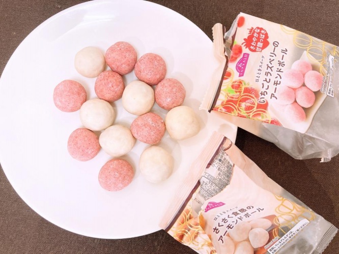 6月20日現在は、「さくさく食感のアーモンドボール」「いちごとラズベリーのアーモンドボール」「メープルのアーモンドボール」の3種類が販売中です。