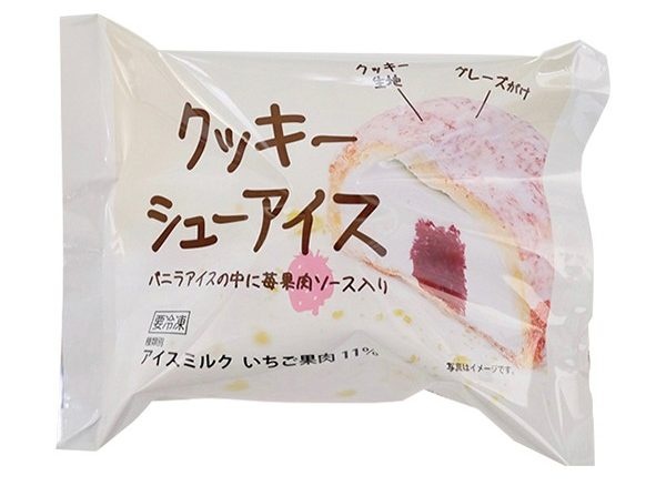 グレーズかけしたクッキー生地のシューアイスに、苺果肉ソース入りミルクアイスを詰め込んだ、シューアイス。[ファミリーマート限定・数量限定]