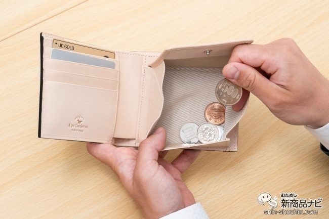 記者的に一番使い勝手が良かったのがBOX仕様の小銭入れだ。どうしても薄型財布と小銭の相性は悪いものだが、お会計の際にパッと広げて中身を一瞥して適切な小銭をすぐに取り出せるのは、ポイントが高い。
