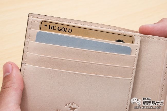 メインのカードポケットには4枚のカードを収納できる。ここは常時使うクレジットカードたちが入るケースが多いだろう。記者が昔使っていた二つ折り財布は、手前側のカードポケットのカードは取り出しやすかったが、奥側のカード入れが取り出し辛いという欠点があった。