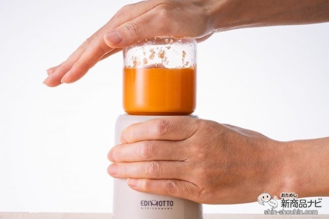 容器を押してかくはんすると、みるみるうちになめらかになって、1分もしないうちににんじんポタージュの完成だ!