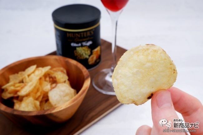 じゃがいものおいしさが感じられるポテトチップス。ザクザクした食感がおすすめの『ハンター ポテトチップス 黒トリュフ風味/ヒマラヤソルト味』 。おやつだけでなく、お酒のおつまみにもおすすめしたいそのおいしさ。赤ワインとのペアリングも楽しみながらご紹介しよう。