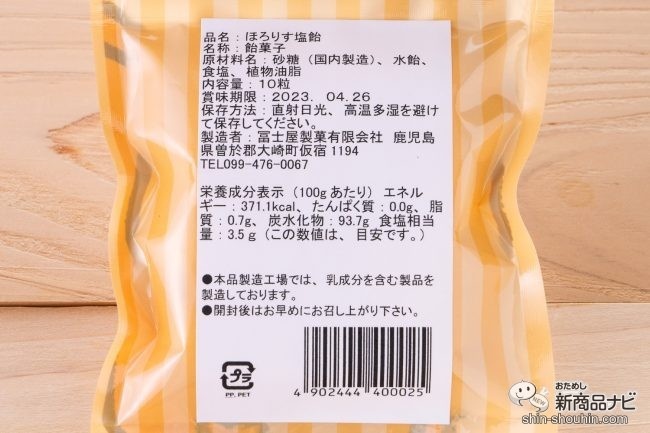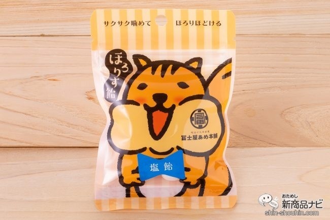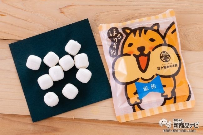 1つめは明治19年創業の富士屋あめ本舗(鹿児島県)の『ほろりす塩飴』(10粒入・実勢価格 税込270円・発売中)。100年以上サツマイモの甘みを活かした無添加飴「からいも飴」を作り続ける老舗飴メーカーがつくる塩飴だ。
