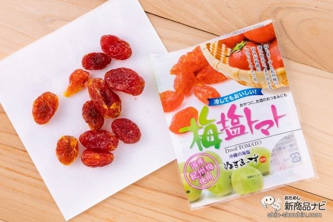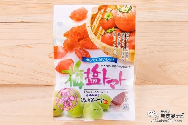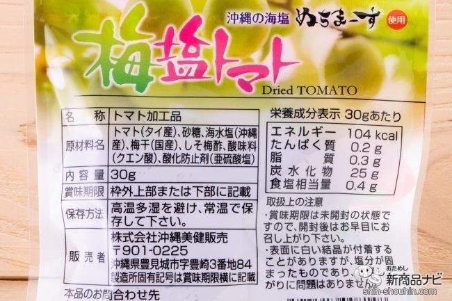 国産紀州梅使用2つ目は、沖縄の素材を使った健康食品の開発・販売をする沖縄美健販売(沖縄県)のオリジナル商品、『梅塩トマト』(30g・実勢価格 税込180円・発売中)。沖縄の海塩「ぬちまーす」を使用したドライトマトだ(沖縄の方言の造語。命のことを「ぬち」、塩のことを「まーす」という)。