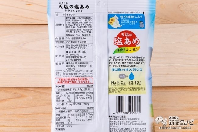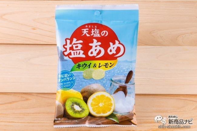 続いては、「赤穂の天塩」でおなじみの塩メーカー、天塩(兵庫県)の『天塩(あましお)の塩あめ キウイ&レモン』(70g・希望小売価格 税込205円・発売中)。「塩屋が作った塩あめ」をコンセプトとした、塩の粒感を感じられる一品だ。塩飴では珍しく、キウイとレモンのフレーバー仕立てとなっている。