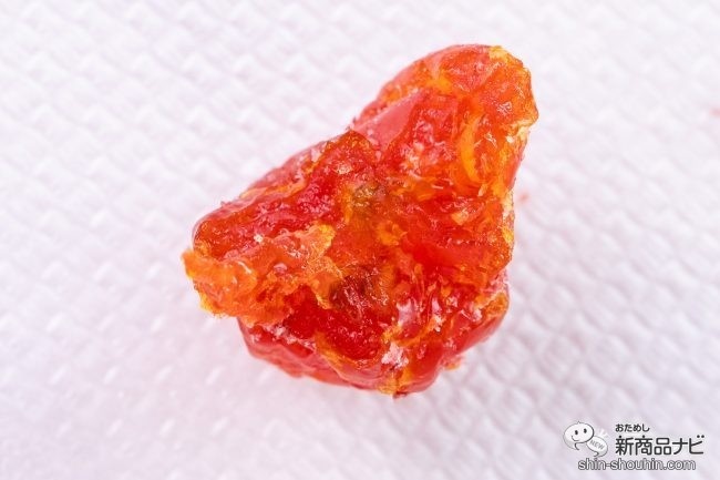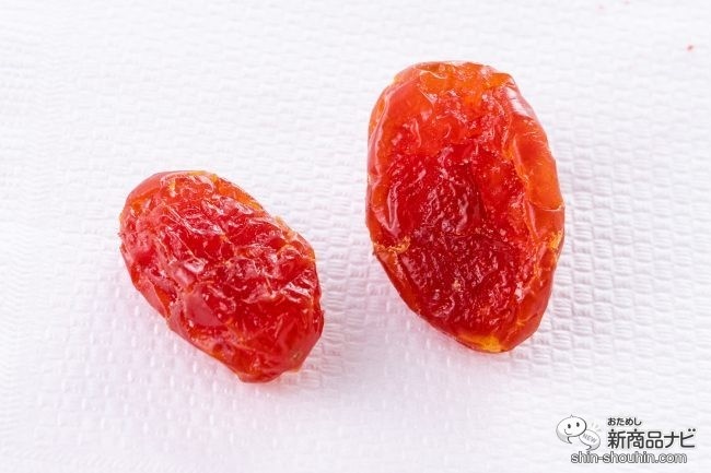 おそらくプチトマトを乾燥させたもの。うっすら透き通っている梅の香りを感じながら実食。舌に触れるとすぐに塩味を感じるが、塩辛さはほとんどなくうっすらと感じる程度。むしろこの後にくるトマトの甘みを引き立てるような使い方となっている。ドライトマトをひと噛みすると、これがおどろくほど甘い。ドライフルーツらしい濃厚でまろやかな甘さが広がる。