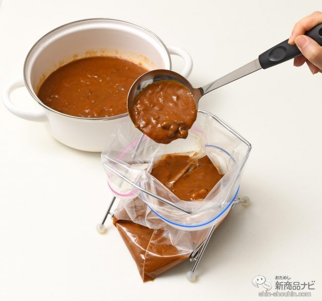 おなじみのこのシーンも、広口ならもっとスマート。お玉が袋の口に付かないよう慎重に…なんてしなくても、こぼさずキレイに入れられる。鍋ごと流し込んじゃってもいいくらい!?