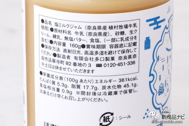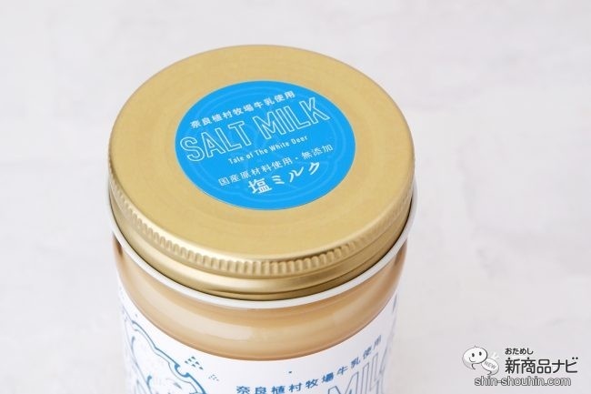 奈良県奈良市にある県内最古の牧場「植村牧場」でとれた牛乳を使用。植村牧場の名物と言えば、新鮮な牛乳だからこそ作れるソフトクリーム。その濃厚な味わいは大人気。そんな新鮮でおいしい牛乳を丁寧にコトコト煮詰めて出来上がったのがこの『塩ミルク』である。