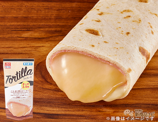 ハムとチーズの人気具材をトルティーヤ生地で包んだ一品。通常商品と比較して、チーズ量を2.5倍に増量。