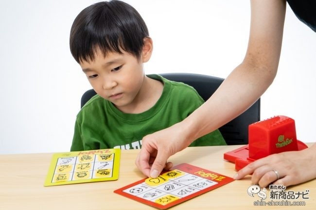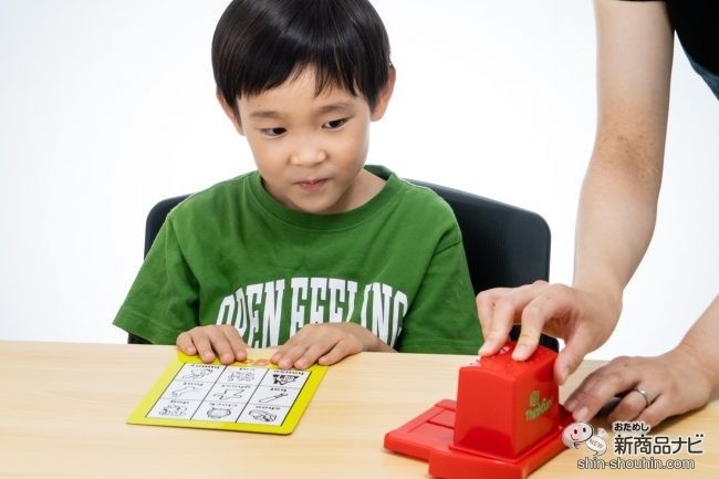 マシーンのユニークな動作が、子どもの好奇心を刺激!ジンゴマシーンのスライドを繰り返すこと数回、ついに手持ちのカードにある英単語と同じ英語タイルが出てきた。「shoe」と叫んだ息子は、素早く英語タイルを1枚ゲット。